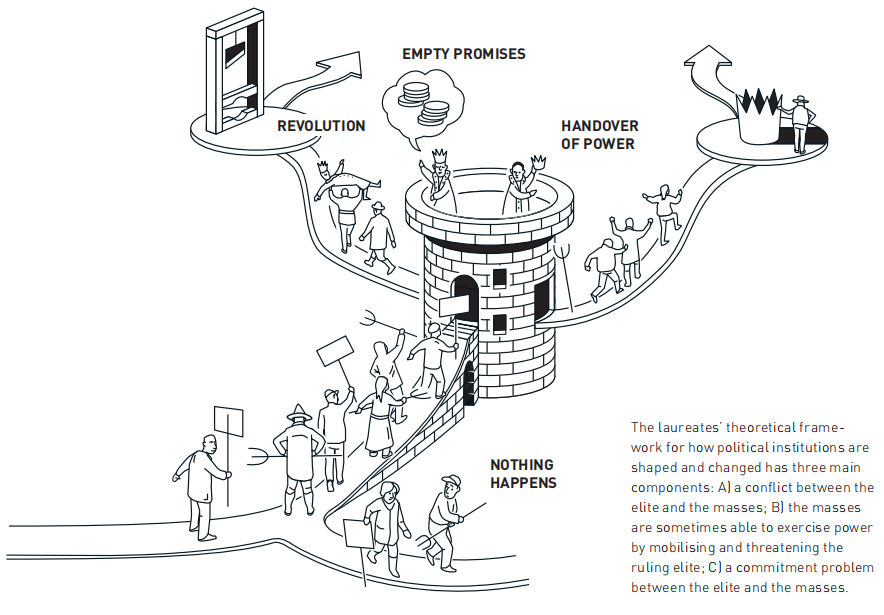获奖者的理论框架研究了政治制度是如何形成和改变的,该框架有三个主要组成部分:A)精英和大众之间的冲突;B)大众有时能够通过动员和威胁统治精英来行使权力;C)精英和大众之间的承诺问题。来源:诺贝尔奖官网
