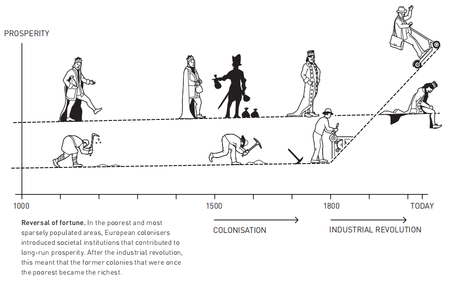 殖民制度最初的差异是导致如今不同地区繁荣程度巨大差异的重要原因。在最贫穷、人口最稀少的地方,欧洲殖民者引入或保留了促进长期繁荣的制度;在最富裕、人口最密集的殖民地,制度更具掠夺性,不太可能为当地人口带来繁荣。这种相对繁荣的逆转在历史上是独一无二的。