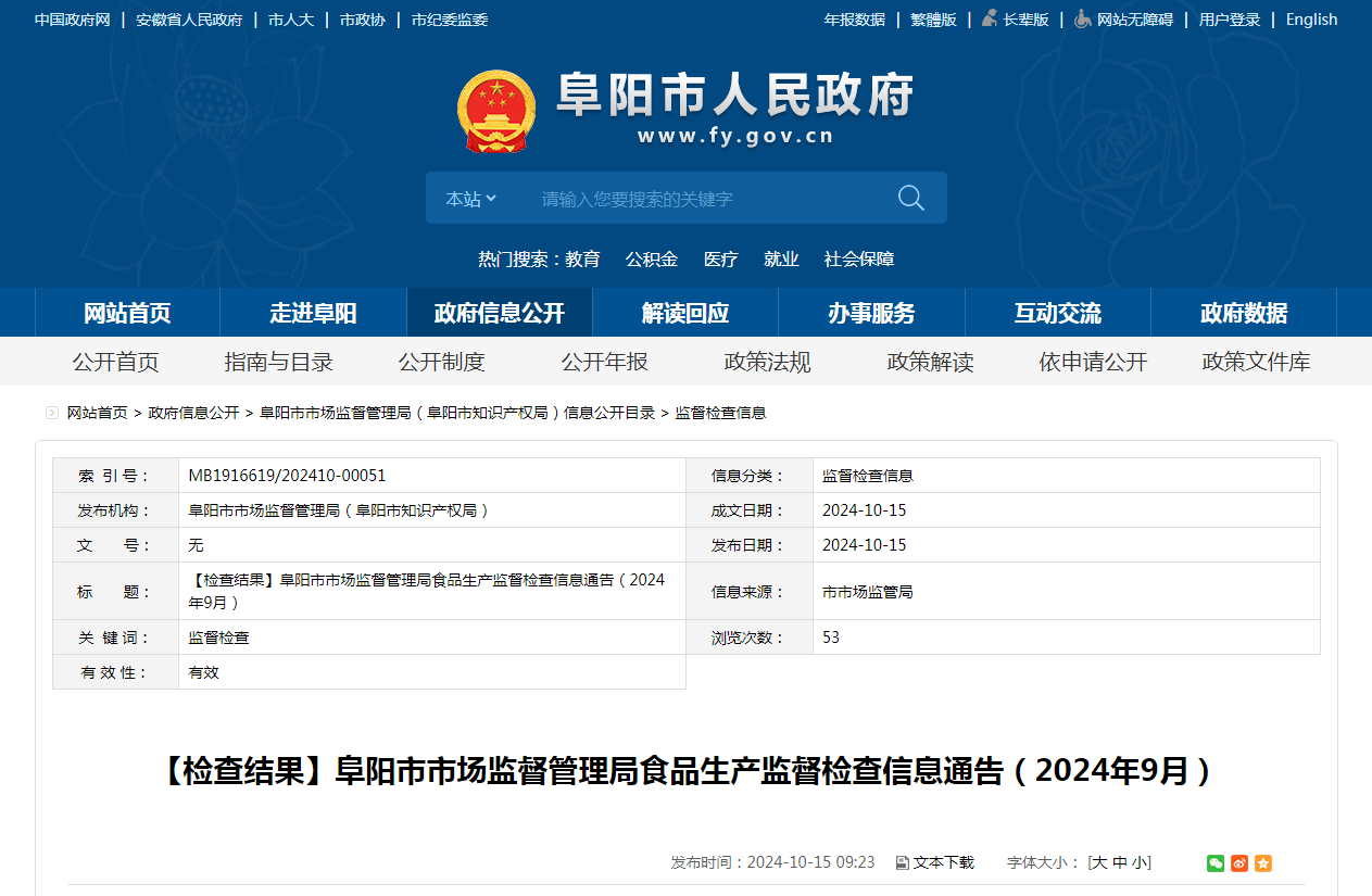 安徽省阜阳市市场监督管理局食品生产监督检查信息通告(2024年9月)