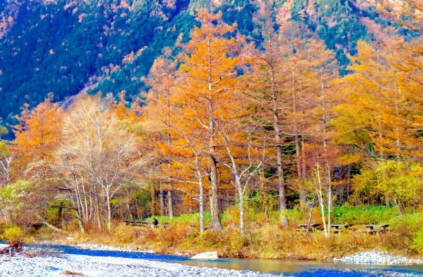 去之前朋友对我说,上高地是观鸟胜地!我抱着期待踏上徒步路,很快发现季节不对,鸟是有的,但十月温度已不高,此地著名的日本歌鸲到更暖和的地方过冬去了,只剩几种不怕冷的常居客,鹪鹩、大山雀、普通 和小星头啄木鸟。小星头极为开朗,就在徒步路边的树上啄木,游客纷纷拿出手机拍照。徒步路的前半段在林中,秋意还不那么浓,随着往里走,逐渐出现变黄的槭树,卫矛缀着红果,不再有背着小包步态悠闲的游客,沿途打招呼的人都是冲锋衣加登山鞋的打扮,有的和我的同伴一样,身后的大包一看就是露营用的。