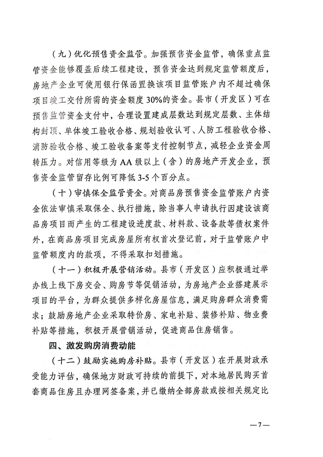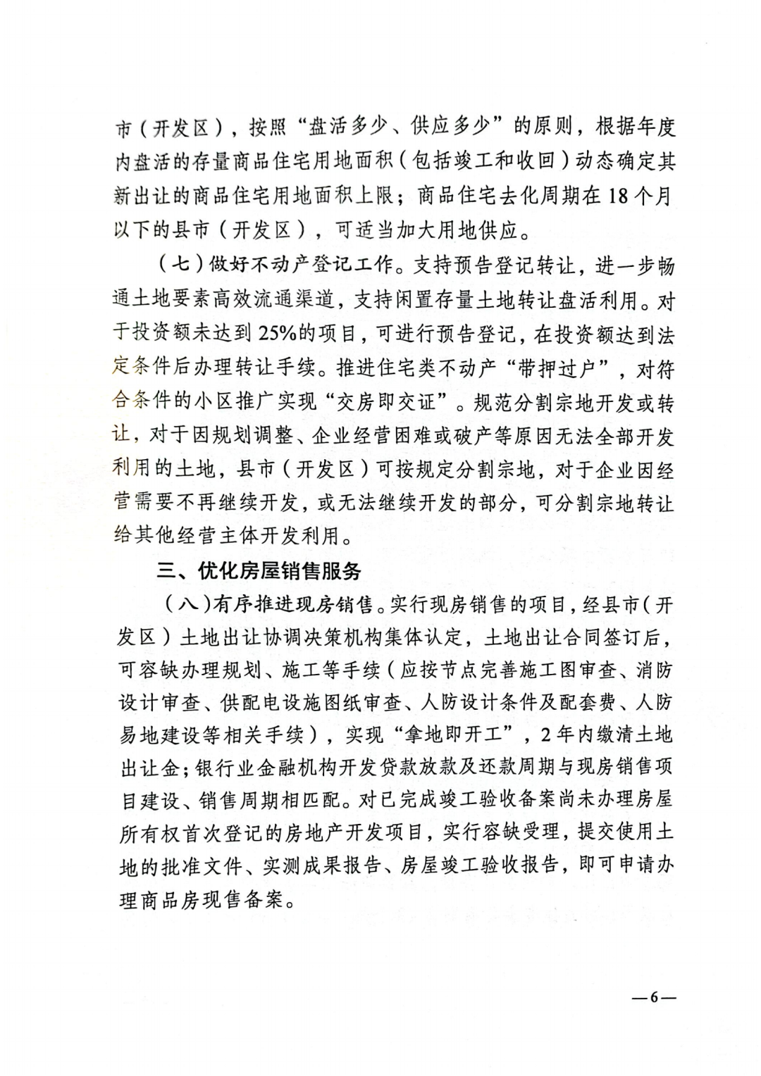 加大保障性住房供给。支持县市(开发区)以不超过同地段保障性住房“重置价格”收购房地产企业已建成存量商品现房,用作配售型保障性住房,面向工薪收入群体公平公正公开分配;鼓励引导产业园区、企事业单位等主体利用自有或闲置用地筹集建设保障性租赁住房,不设户籍、收入等门槛,低于同地段市场租金,满足新市民、青年人住房需求。鼓励县市(开发区)结合实际,自主开展棚户区改造。