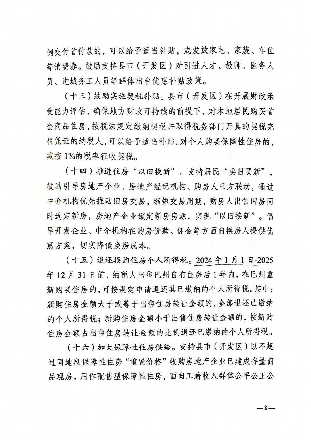 退还换购住房个人所得税。2024年1月1日至2025年12月31日前,纳税人出售巴州自有住房后1年内,在巴州重新购买住房的,可按规定申请退还其已缴纳的个人所得税。其中:新购住房金额大于或等于出售住房转让金额的,全部退还已缴纳的个人所得税;新购住房金额小于出售住房转让金额的,按新购住房金额占出售住房转让金额的比例退还已缴纳的个人所得税。
