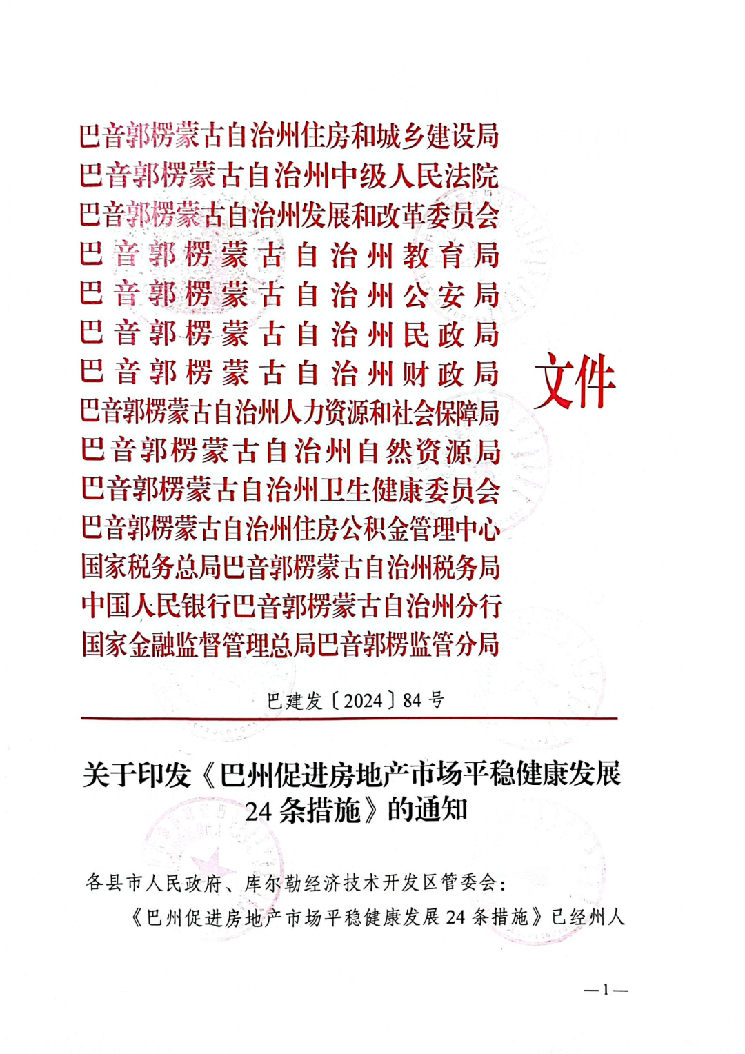 据巴州房地产业协会10月14日消息,近日,新疆维吾尔自治区巴音郭楞蒙古自治州等14部门联合印发《巴州促进房地产市场平稳健康发展24条措施》的通知。