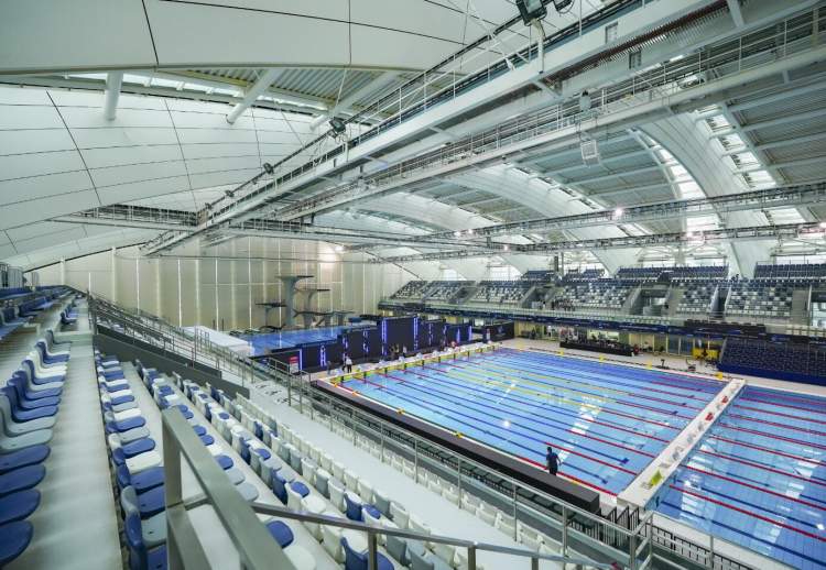 游泳馆原为水深3米的50米的标准泳池,根据赛事要求,东方体育中心在最短的时间内完成了50米赛道变更至25米赛道的转换,并经过多次试验及论证,实现了在比赛池内池底划线的带水作业。东方体育中心通过高级过滤系统(硅藻土过滤+氯加臭氧消毒结合+智能24小时水质管理系统)、精准消毒技术、智能水质管理系统三方面严格要求,确保比赛池、训练池(热身池)的水质都达到了“最高级别”,可以充分满足运动员对水感、阻力、视线等多方面的最高要求。专业的泳池得到了中国泳协和世界泳联的充分肯定。