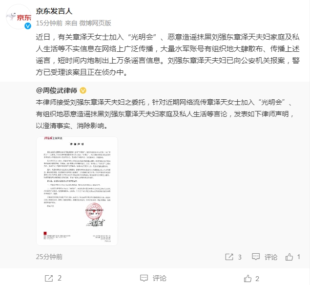 10月16日,@京东发言人 发布声明称,近日,有关章泽天女士加入“光明会”、恶意造谣抹黑刘强东章泽天夫妇家庭及私人生活等不实信息在网络上广泛传播,大量水军账号有组织地大肆散布、传播上述谣言,短时间内炮制出上万条谣言信息。刘强东章泽天夫妇已向公安机关报案,警方已受理该案且正在侦办中。