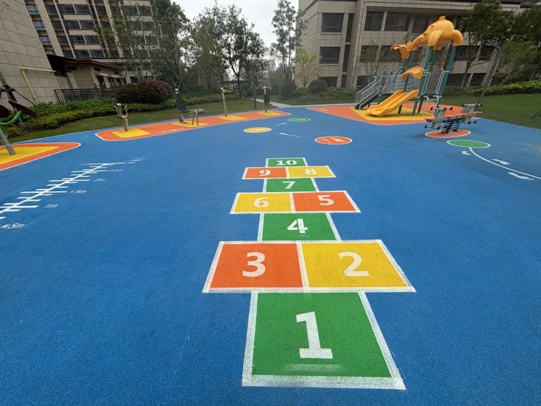 健身苑点集合了双位上肢牵引器、双位太空漫步机、双位扭腰器等多种器材,在彩色塑胶地面,还设置了立定跳远、跳房子、跷跷板等多种青少年活动项目。