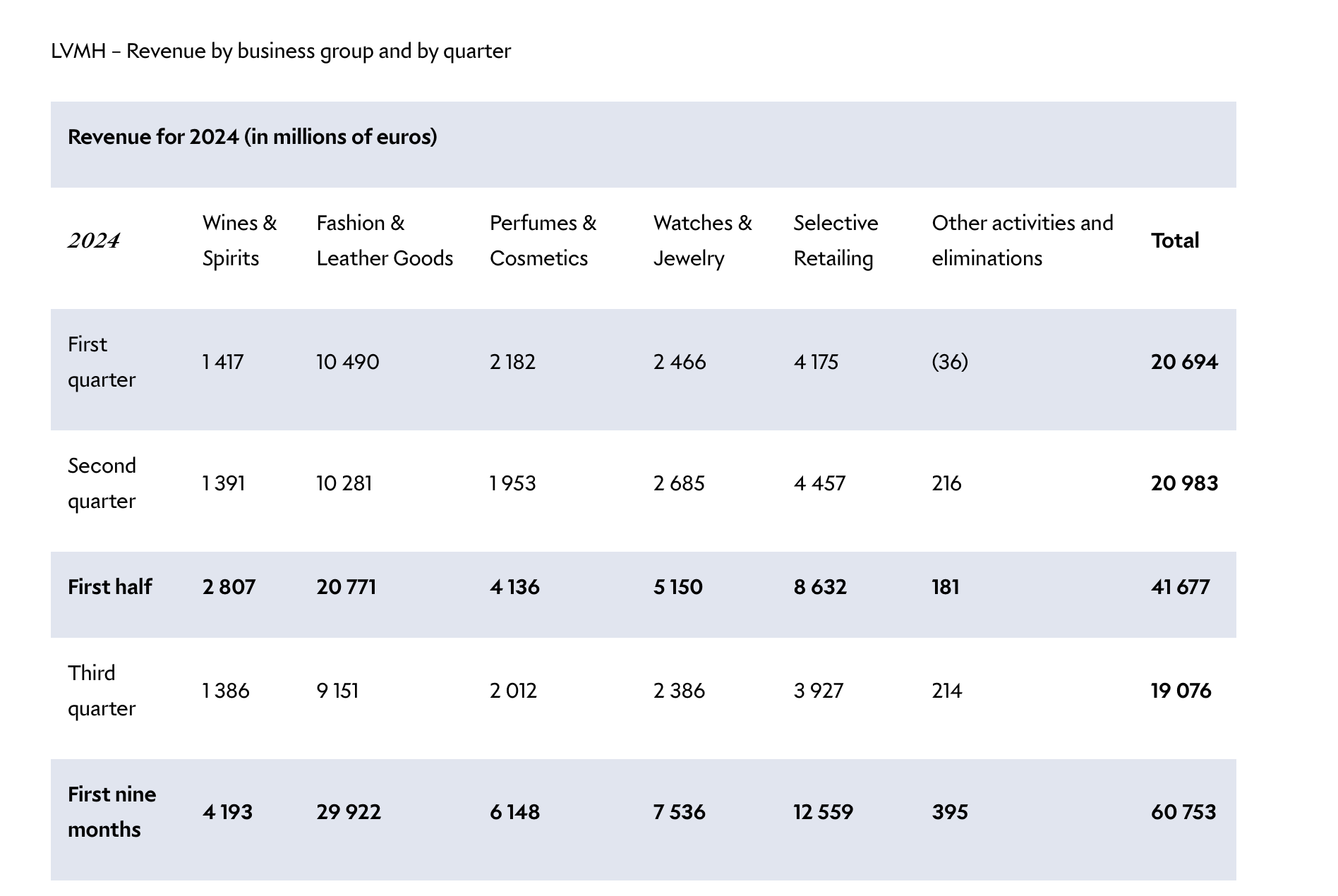 综合评价各业务在2024年前九个月的表现,LVMH集团在财报中称,前九个月葡萄酒和烈酒业务集团的收入有机下降8%。香槟下降,反映出新冠疫情后需求的持续正常化,但仍明显高于2019年。轩尼诗干邑受到中国市场疲软的本地需求的阻碍,而美国在第二季度恢复了增长,市场仍然保持谨慎。时尚与皮草前九个月在基础上基本稳定,表现出良好的弹性,并获得了市场份额。香水和化妆品业务在前九个月实现了5%的有机收入增长,这得益于创新战略和分销政策。手表和珠宝业务的有机增长略有下降。