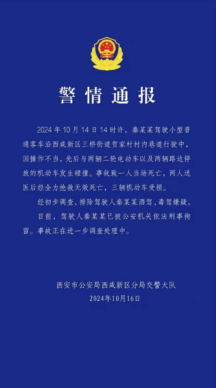 10月16日晚,西安市公安局西咸新区分区交警大队发布警情通报称:2024年10月14日14时许,秦某某驾驶小型普通客车沿西咸新区三桥街道贺家村村内巷道行驶中,因操作不当,先后与两辆二轮电动车以及两辆路边停放的机动车发生碰撞。事故致一人当场死亡,两人送医后经全力抢救无效死亡,三辆机动车受损。