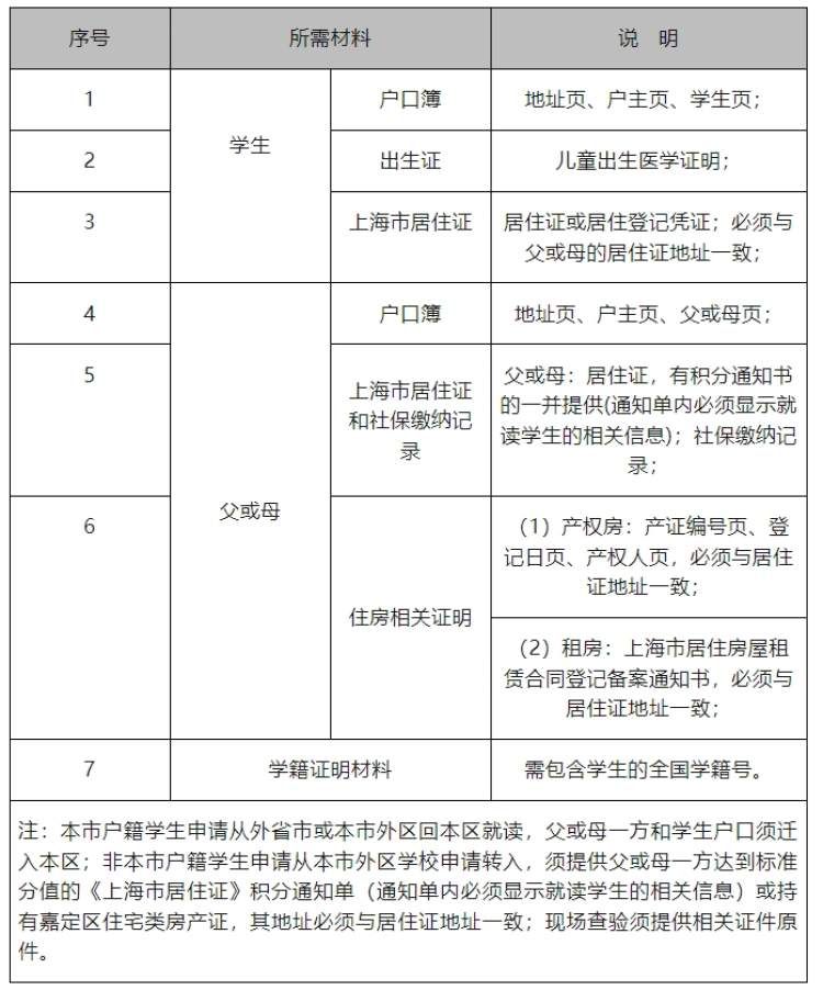 1.通过什么渠道可以获取义务教育阶段学校招生入学信息?可关注“嘉定教育”微信公众号,当年度本区义务教育阶段学校招生入学工作的实施意见及招生入学工作相关文件,一般在3月底、4月初发布。建议同步关注上海嘉定教育频道网址:http://www.jiading.gov.cn/jiaoyu/、各街镇微信公众号等,第一时间掌握关于义务教育阶段学校招生入学的相关资讯。2.本市(本区)户籍“人户分离”适龄儿童和学生如何办理登记入学?本市户籍的适龄儿童和学生确有困难不能在户籍地入学,选择在本区申请跨区居住地入学(截止日见当年度招生文件),凭本区《本市户籍人户分离人员居住登记(回执)》或《本市户籍人户分离人员居住登记凭证》(以上两份材料统称“人户分离证明”),适龄儿童在现就读幼儿园进行信息登记;小学五年级学生向现就读小学提出申请,由学校告知核对证件、网上申请、统筹安排等事项,家长在网上填报《本市户籍学生回户籍(居住)地就读申请表》,经核对符合条件的,由区教育局统筹安排进入公办初中学校就读。本区户籍的适龄儿童和学生确有困难不能在户籍地入学,选择跨街镇居住地入学(截止日见当年度招生文件),凭居住地所属街镇的人户分离证明与居住地址相应的房地产权证(含农村自有宅基地证,产权人仅为本人、父母、祖父母、外祖父母、同父母或继父母且未成年的兄弟姐妹),适龄儿童在现就读幼儿园进行信息登记;小学五年级学生在现就读小学进行信息更正。同一街镇内不接受“人户分离”申请。跨区、跨街镇“人户分离”的适龄儿童和学生,将根据当年度本市户籍“人户分离”适龄儿童和学生的入学实施细则统筹安排。本区其他寄放户口(含集体户口)的适龄儿童和学生,参照居住地登记入学办法,由区教育局视公办学校招生实际情况统筹安排。3.本市户籍五年级学生申请回户籍(居住地)入学,如何办理?外区小学五年级学生申请到本区入学:目前在本市外区就读的小学五年级学生,如持有本区户籍或持有本区人户分离证明或居住本区配住廉租房,确需到本区就读初中,家长须在规定时间前向现就读小学提出申请,由就读小学告知核对证件、网上申请、统筹安排等事项,家长在网上填报《本市户籍学生回户籍(居住)地就读申请表》。经核对符合条件的,由区教育局统筹安排进入公办初中学校就读。本区小学五年级学生申请到户籍(居住)地所在区入学:目前在本区就读的小学五年级学生,如持有本市外区户籍或人户分离证明,可选择到户籍或人户分离证明所在区就读初中,也可按照本区相关规定申请继续就读。家长须在规定时间前决定就读去向,在现就读小学办理相关就读申请。选择到户籍或人户分离证明所在区就读初中的,由现就读小学告知核对证件、网上申请、统筹安排等事项,家长在网上填报《本市户籍学生回户籍(居住)地就读申请表》。经核对符合条件的,由户籍(居住)地所在区教育局统筹安排进入公办初中学校就读。在外省市就读五年级的本市户籍学生、符合条件的非本市户籍学生,如需在本区申请就读六年级,需在规定时间前,通过指定方式办理入学信息登记,获取《上海市初中入学信息登记表》。区教育局将根据学生居住地所属的街镇统筹安排入学。5.来沪人员适龄随迁子女就读本市义务教育阶段学校必须具备哪些条件?根据《上海市人民政府办公厅转发市教委等四部门关于来沪人员随迁子女就读本市各级各类学校实施意见的通知》(沪府办规〔2018〕5号)等要求,来沪人员适龄随迁子女需在本市接受义务教育的,适龄儿童须持有效期内《上海市居住证》或《居住登记凭证》,父母一方满足下列两种情形之一:第一种情形:持有效期内《上海市居住证》,且一年内(如2024年,指2023年7月1日起至2024年6月30日)参加本市职工社会保险满6个月的证明(不含补缴);第二种情形:持有效期内《上海市居住证》,且连续3年(如2024年,指首次登记日起至2024年6月30日)在街镇社区事务受理服务中心办妥灵活就业登记。区教育局将结合本区实际,统筹安排适龄随迁子女入学。来沪人员随迁子女入学,义务教育阶段统一安排进入公办学校就读。初中入学后,由学校告知来沪人员随迁子女学生及家长完成义务教育后报考高中阶段学校的相关规定和政策。民办初中招生实行网上报名,有意愿选择民办初中就读的学生,请家长务必仔细阅读民办初中发布的招生简章,特别是招生计划类型及其条件、收费情况等,并于规定时间进行民办初中网上报名。报名时登录“一网通办”网站义务教育入学专栏或“入学报名系统”,点击“民办初中报名”按钮进行网上报名。进入网上报名页面,会出现“报名指南”,提示家长要通过“报名登录”“填报志愿”“确认提交”“报名成功”四个环节方能确保报名成功。家长须仔细阅读“报名指南”并勾选“我已阅读民办初中网上报名指南,知晓报名步骤,同意报名成功后不再进行修改”后,方可正式报名。完成小升初信息核对的学生家长,须进行在线报名,进入民办初中报名页面,进入志愿填报流程。先自动跳转到所确定的区,再填报民办初中志愿。每个学生可填报1个民办初中报名志愿,并可填报1个民办初中调剂志愿。调剂志愿分为三类:同校调剂(同校内住宿或走读等分类计划间调剂)、区内调剂(就读意愿区内其他民办学校间调剂)、集团内调