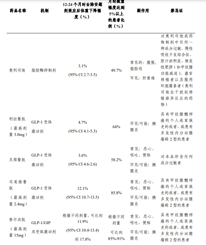 国内已获批用于治疗原发性肥胖症的药物比较 来源《指南》