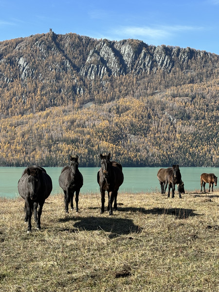 从夏末的上海前往北疆,我准备了四季衣物,一层一层穿在身上,果然都派上了用场,我与同行三人先是在乌鲁木齐汇合,阳光所及与未及之处温差甚大,驱车前往吐鲁番,探高昌古城遗址:玄奘西行踏过的土地处处是他的雕塑,却不见与他结拜、助他西行又以悲剧收场的高昌王;从柏孜克里克千佛洞向外观看,傍晚的火焰山是夺目的金色,洞内的佛像是价值极高的艺术品,曾在这耀眼的自然美景中诞生,多年后又在这美中毁于一旦。驶过巴音郭楞蒙古自治州,经过库车市,我们买了几个大馕和一些牛肉干在路途中备用,途遇一群奔跑的骆驼,其中一只冲向我们,试图把头伸进车窗里;翻越天山山脉,我们在克拉玛依的公路边停下,随处可见的玉石加工厂意味着这里几乎已经没有玉,我们捡了几袋色彩独特的石头。沿途看了沙漠、草原、湖泊、雪山、戈壁滩,历经晴雨雪,我们最终到达喀纳斯。