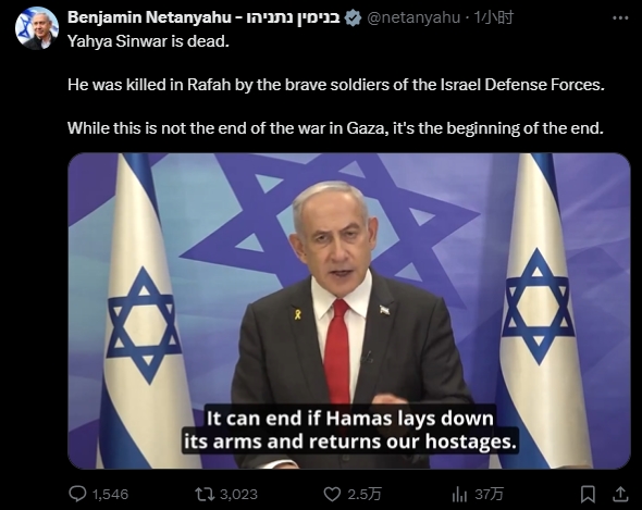 内塔尼亚胡在辛瓦尔死亡后发表视频声明 推文截图