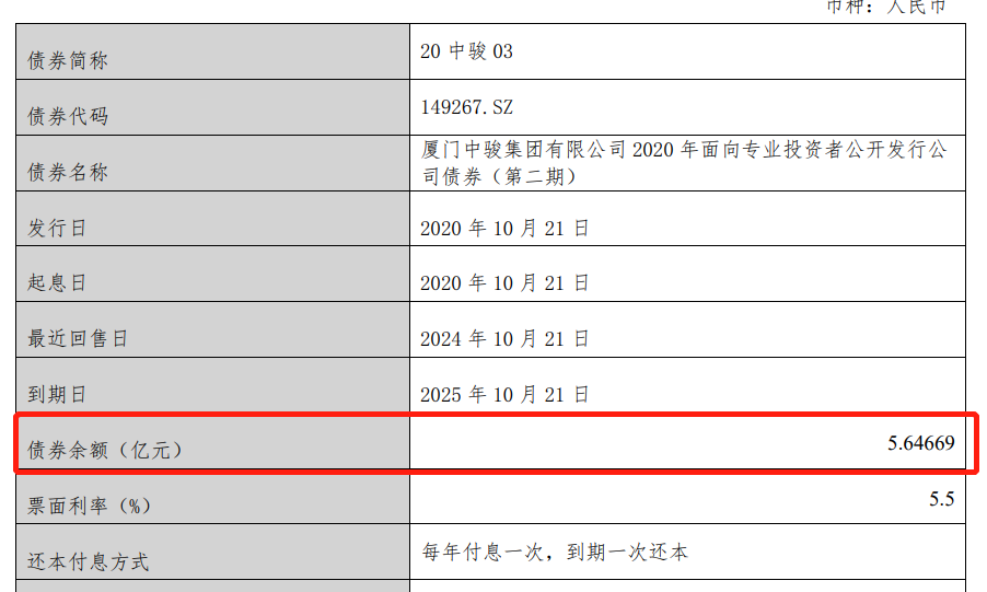 本期债券全称为厦门中骏集团有限公司2020年面向专业投资者公开发行公司债券(第二期),发行规模20亿元,期限为五年(兑付日为2025年10月21日),附第2年末和第4年末公司调整票面利率选择权和投资者回售选择权。
