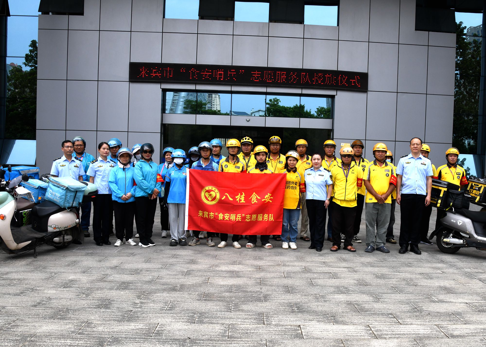 广西来宾市食药安办向首批外卖骑手身兼“五员”志愿服务队授旗