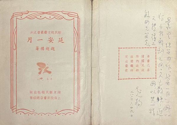 延展自然是大好事,但也带来一个新的问题,要跟借展的单位和个人一一打招呼。其中,有一件展品,既珍贵,又特殊,就是《延安一月》的重庆版初版本,借自上海图书馆。我们随即跟上图联系,希望能够延长借展日期。上图方面经研究答复说,可以延长借期,但按规定,上图文物借展最长是一个月。这样一来,到10月上旬,也要归还了。我曾听中国近现代新闻出版博物馆副馆长张霞说,他们馆藏也有《延安一月》初版本。我想,何不按时归还上图的,把新闻出版馆的替上?