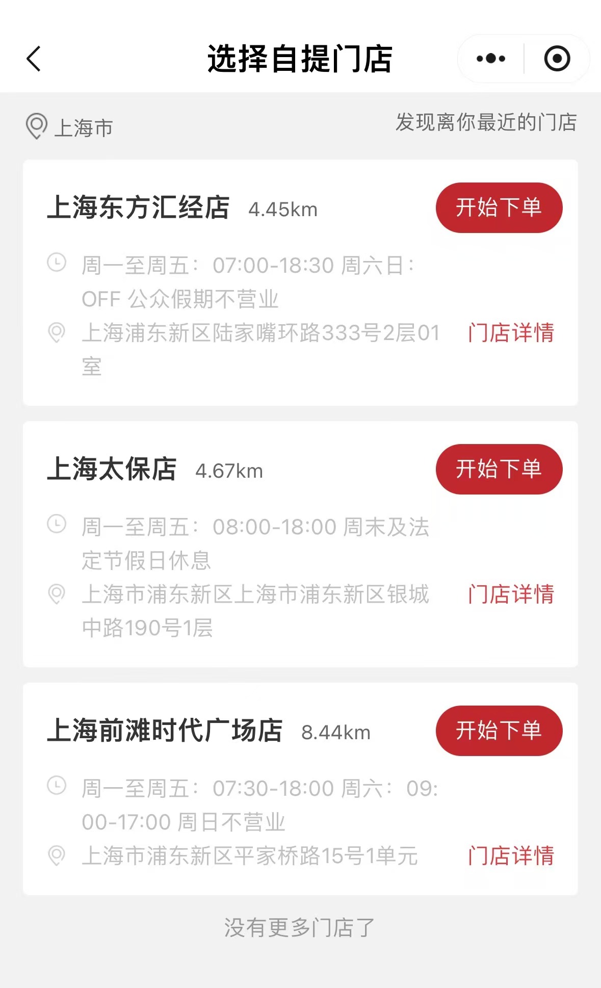 澎湃新闻记者查询上海门店发现,10月20日周日,在“太平洋咖啡”的小程序上,虽然能查到3家门店名,但每一家后面都备注“本店休息中,您可切换门店”。当日17时左右,澎湃新闻记者依次拨打3家门店电话。上海前滩时代广场店以及上海东方汇经店均无人接听。上海太保店接线员告诉记者,该店周一至周五营业,周末及法定节假日休息。澎湃新闻记者留意到,在品牌小程序上,上海前滩时代广场店显示的营业时间为周一至周五07:30-18:00,周六09:00-17:00,周日不营业。上海东方汇经店与太保店一样,都是周末及法定节假日休息。