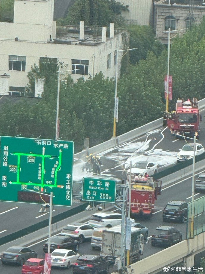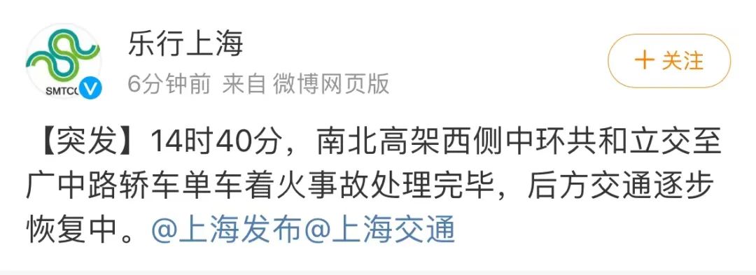 14时40分,南北高架西侧中环共和立交至广中路轿车单车着火事故处理完毕,后方交通逐步恢复中。