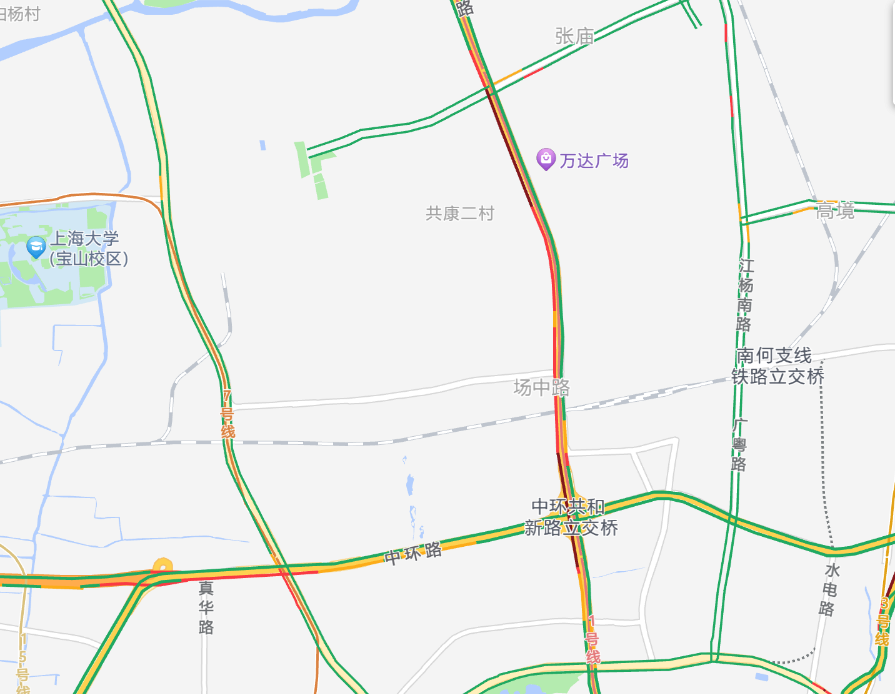 14时02分,南北高架西侧中环共和立交至广中路轿车单车着火事故仍在处理中,明火已扑灭,后方车辆拥堵至呼玛路。