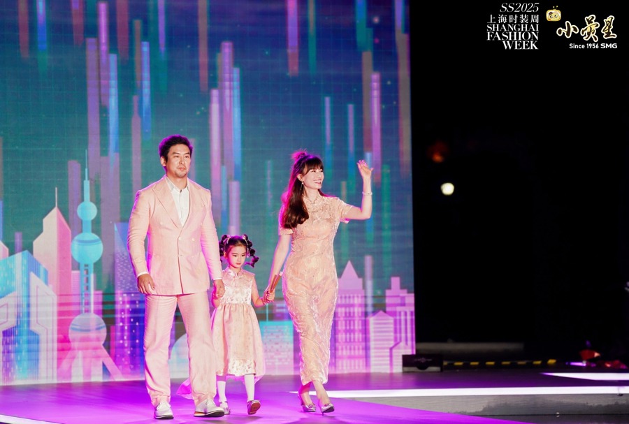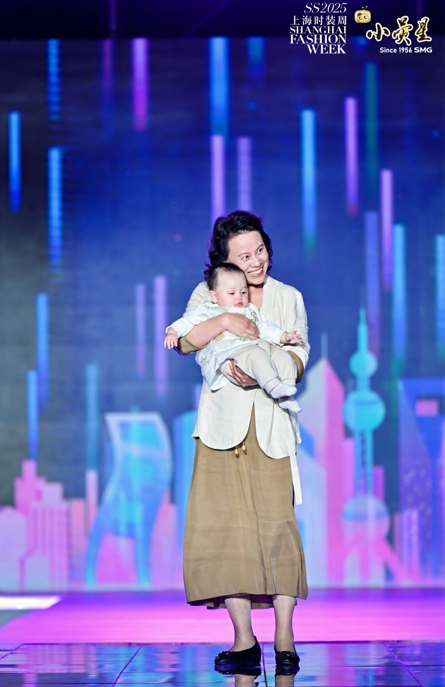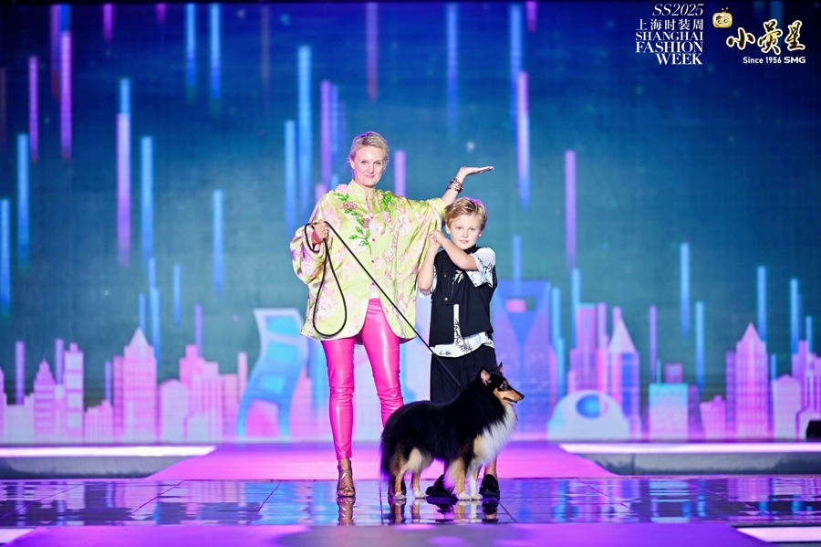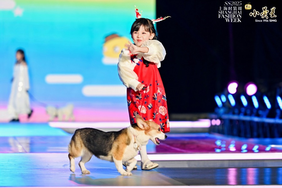 大秀亲子同台环节中,家长们陪伴孩子学习走秀技巧,一起走上T台展示亲子装。大秀另一大亮点是萌宠走秀,小动物与小朋友一起踏上T台。柯基犬来福的主人分享,“上个月,我家娃看到来福蜷缩在草堆,把它带回家。今天娃和来福一同踏上上海时装周T台,也是对彼此情感的最好见证。”