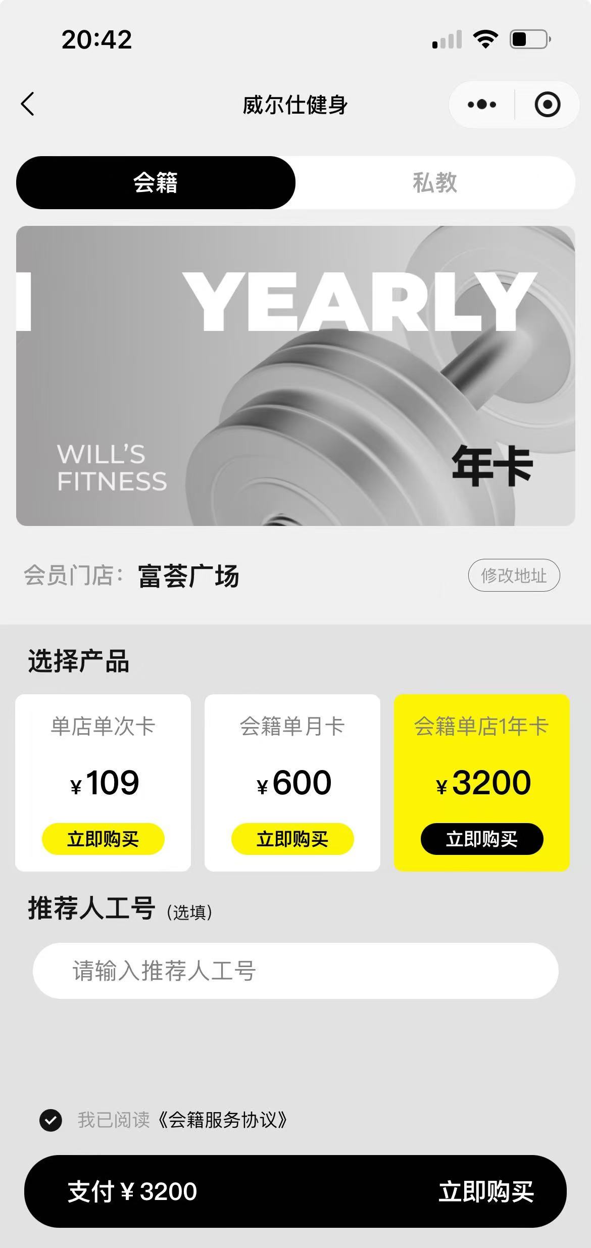 尽管门店未开,但威尔仕健身小程序中,会员办卡对应的门店选项中依然有富荟广场店,并且可以下单购买,其中单次卡109元、单月卡600元、一年卡3200元。