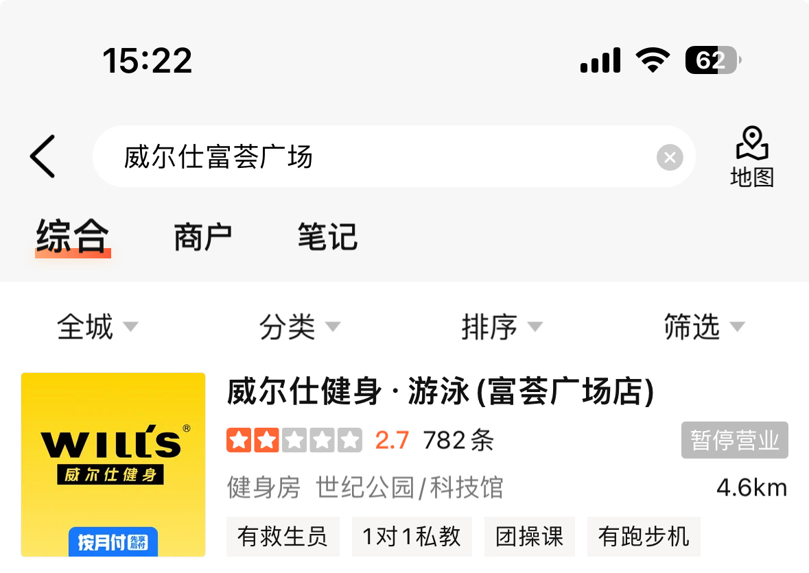 点评网站上显示,威尔仕健身富荟广场店已暂停营业。截屏图