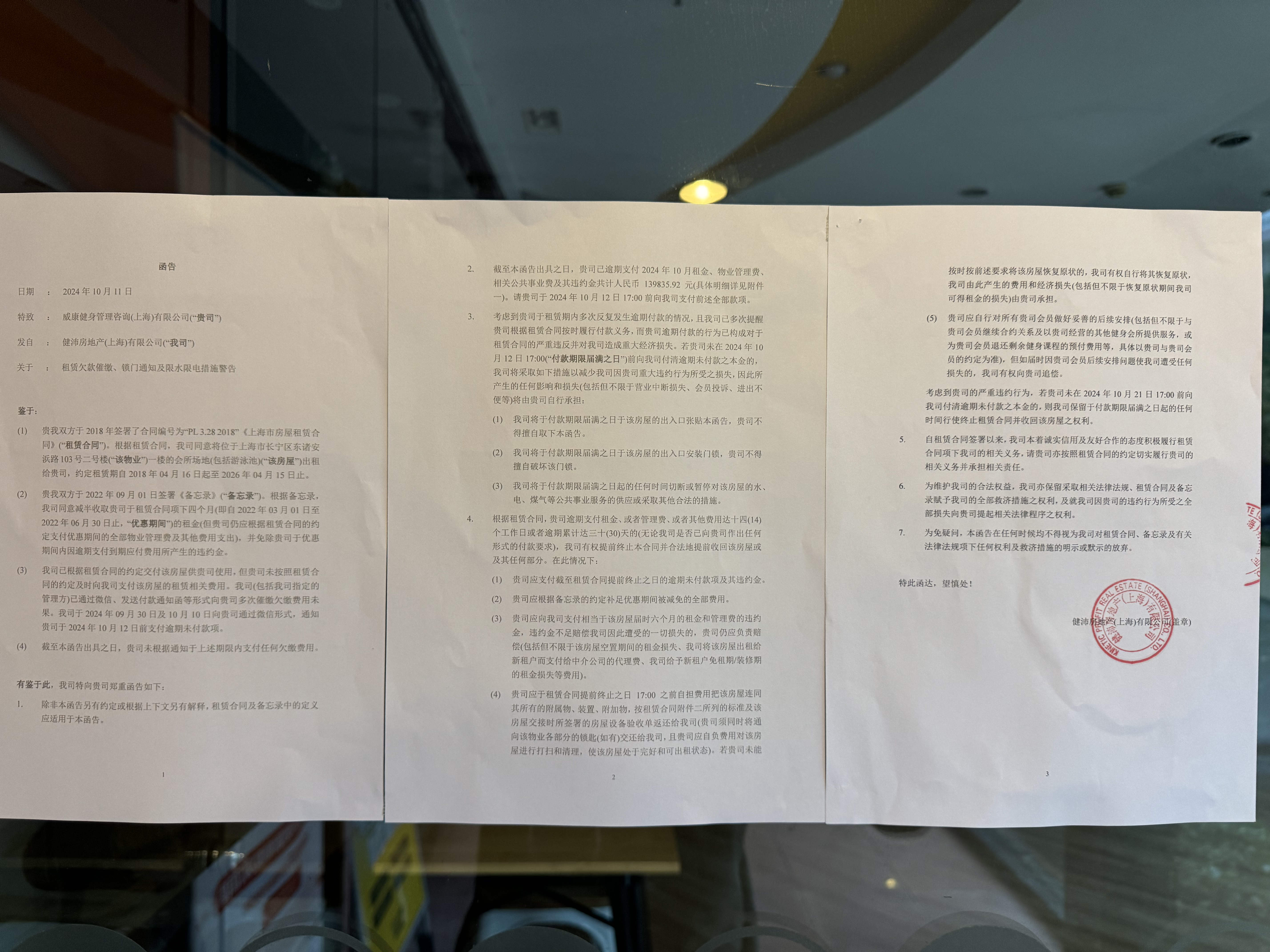 10月15日,记者来到位于长宁区的威尔仕健身维景店,看到店门紧闭,店内空无一人,并且门上被健沛房地产(上海)有限公司贴上欠费催缴的函告,函告日期为10月11日。