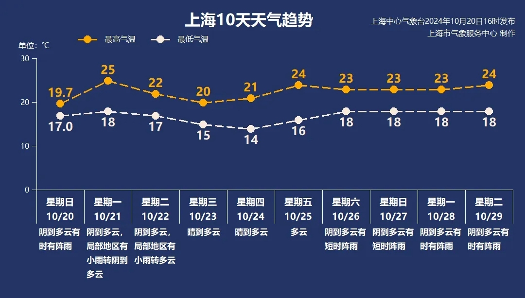 今天(10月20日),上海在冷空气主体影响下,天空云系较多,最高气温在20℃附近,市区徐家汇站19.7℃,全天温差较小,宝山、闵行、徐汇、浦东、崇明等地还下了小雨,体感凉飕飕。
