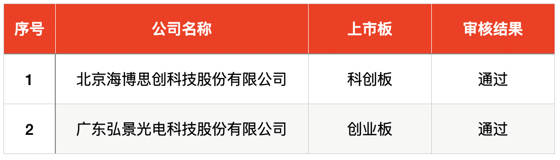 发审委审核方面,上周共有2只新股上会,分别为北京海博思创科技股份有限公司(简称“海博思创”)、广东弘景光电科技股份有限公司(简称“弘景光电”),均获得通过。