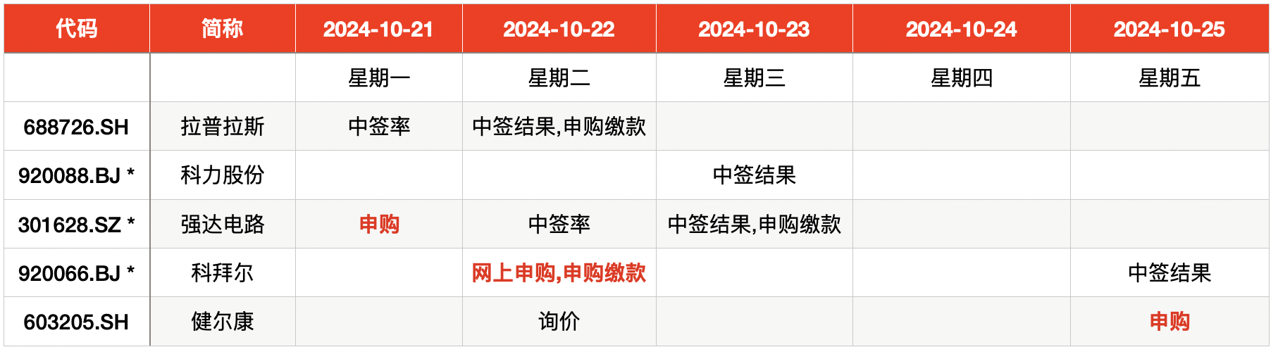 本周一,强达电路开启申购;周二,科拜尔开启申购;周五,健尔康开启申购。