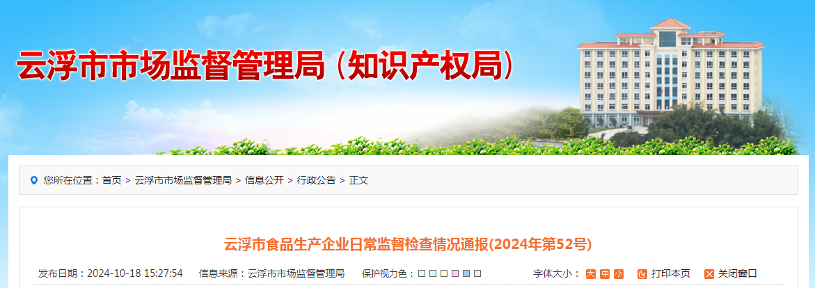 广东省云浮市食品生产企业日常监督检查情况通报(2024年第52号)