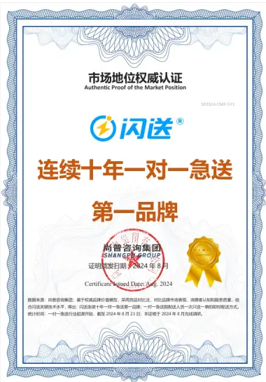 据悉,2024年8月,尚普咨询集团有限公司(以下简称“尚普咨询集团”)对中国一对一急送市场进行深度市场研究,经专家访谈、企业调研,结合终端销售渠道交叉验证,于近日向行业龙头品牌—闪送,颁发了“闪送,连续十年一对一急送第一品牌”的市场地位声明认证!