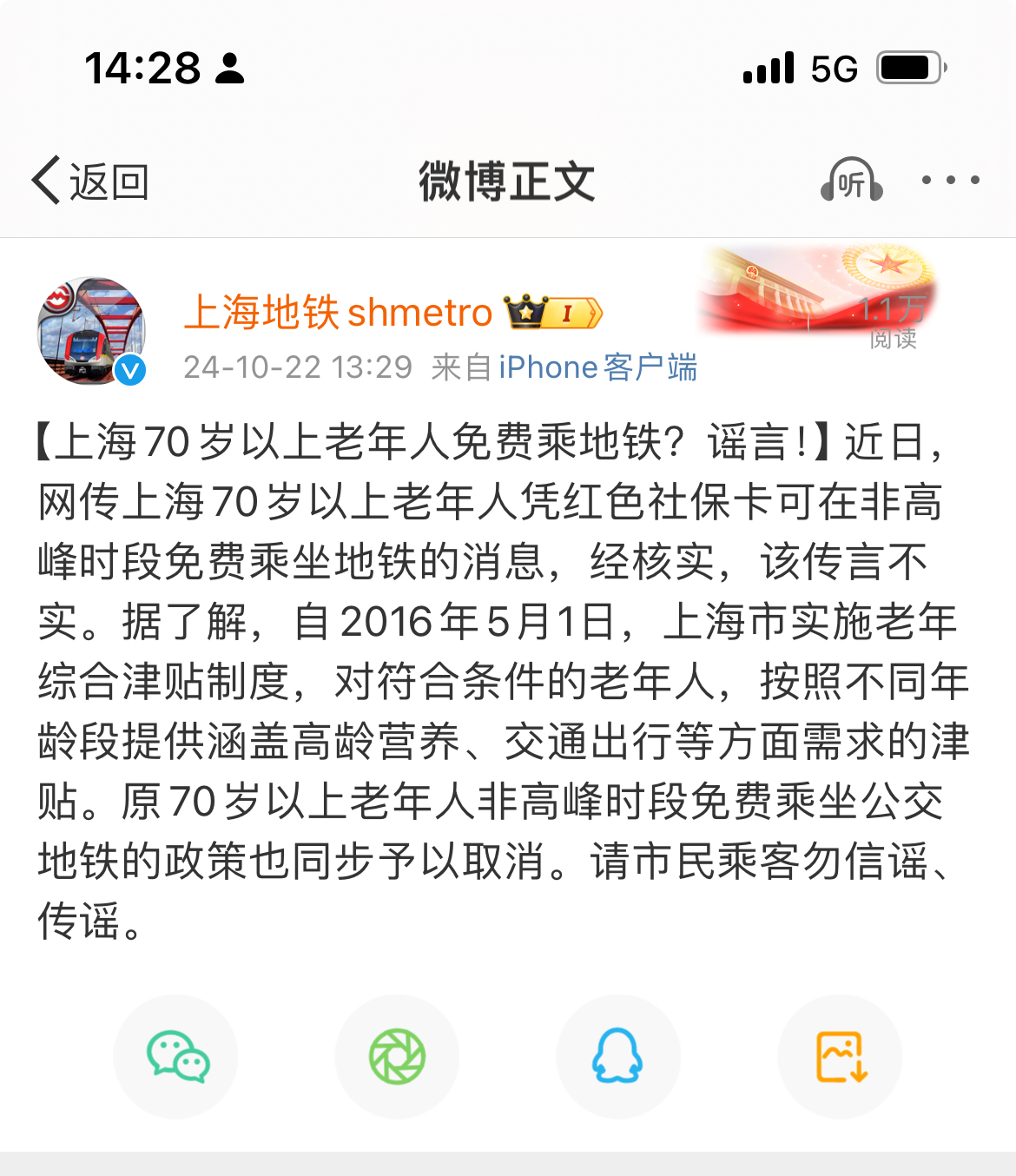 70岁以上老年人在非高峰时段可免费乘地铁?上海地铁:谣言