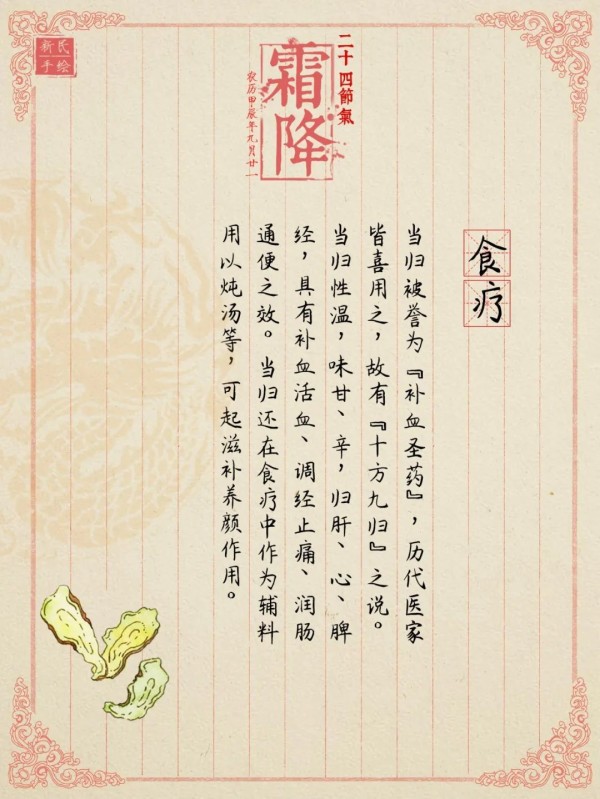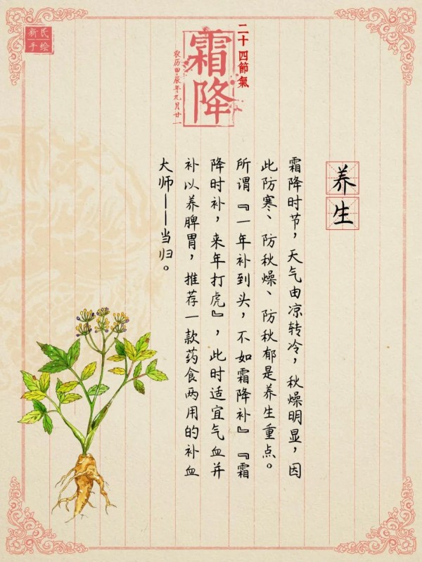 霜降时节,天气由凉转冷,秋燥明显,因此防寒、防秋燥、防秋郁是养生重点。所谓“一年补到头,不如霜降补”“霜降时补,来年打虎”,此时适宜气血并补以养脾胃,推荐一款药食两用的补血大师——当归。