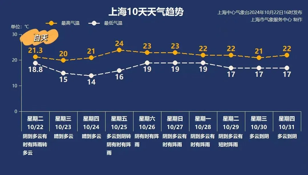 周四上海维持晴好天气,气温在14~21℃之间,早间气温将连创新低,早晚适当添衣。周五白天云系开始增多,气温小幅回升,最高气温在24℃左右。双休日到下周初,受台风外围偏东气流以及冷空气扩散的影响,上海又会多阴雨天气。气温变化总体较为平稳,在19~23℃之间。