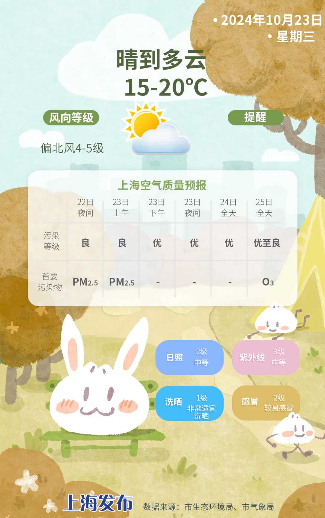 阳光也在今天重返申城。晴到多云,白天秋意浓,最高气温在20℃左右。但早间气温较低,中心城区15℃,郊区11~13℃左右,或为入秋以来新低。阳光限量,大家抓紧洗晒;早晚气温低,注意调整着装。