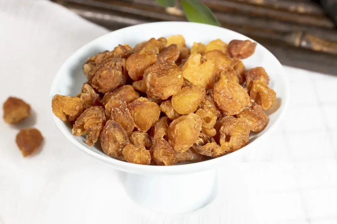 优质的龙眼颗粒饱满、均匀且肉质厚实。龙眼肉由新鲜龙眼去核后烘制而成,原色偏暗红褐,但市面上常可见到被加工成黄色的龙眼肉,显得更为美观诱人,购买时需仔细辨别。