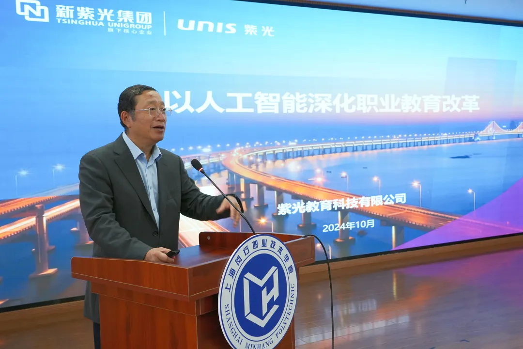 陈永红在主题报告《以人工智能深化职业教育改革》中充分肯定了闵职院在人才培养、专业群建设等方面的成果,展示了闵职院、新致软件和紫光教育酝酿已久的实践基地蓝图。他提出,人工智能与云计算技术正广泛应用于各行各业,形成AI+教育、金融、康养、制造等产业的智能化发展新模式。基地将聚焦“产学”融合,实现双向赋能;做到“产才”互通,引领发展效能;围绕“产创”协同,实现互利共赢。