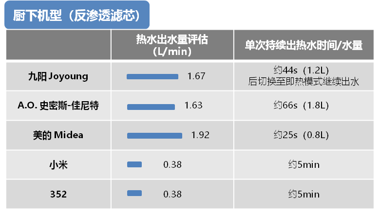 而厨下机型出水量相对更大,持续出水时间也更久,能够满足煲汤、洗菜、生活等大量用水需求。其中,小米、352的2款即热模式净饮机可以做到持续出热水约5分钟,但出水速度相对较慢。九阳、A.O.史密斯-佳尼特的2款储热模式净饮机的热水出水量均超过1.6 L/min,连续出热水时间(水量)分别达到了44秒(1.2L)、66秒(1.8L),综合表现较好,其中九阳净饮机在44秒后机器自动切换至即热模式继续出水。