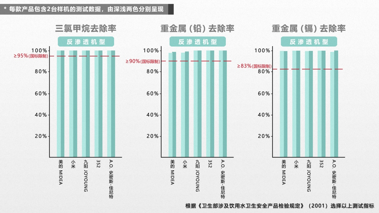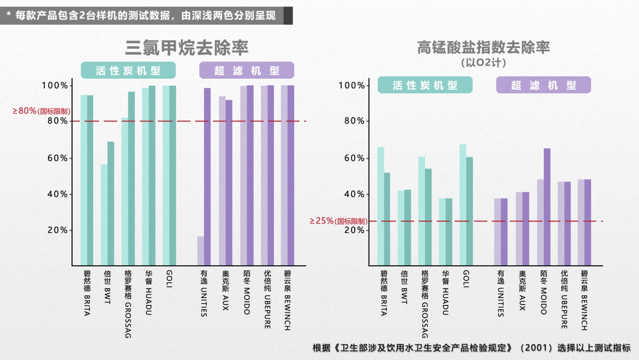 结果发现,有1款活性炭机型和1款超滤机型的三氯甲烷初始点净化效率低于国标要求。从测试数据结果来看,5款反渗透机型净化性能综合表现更佳。