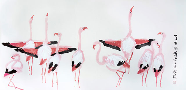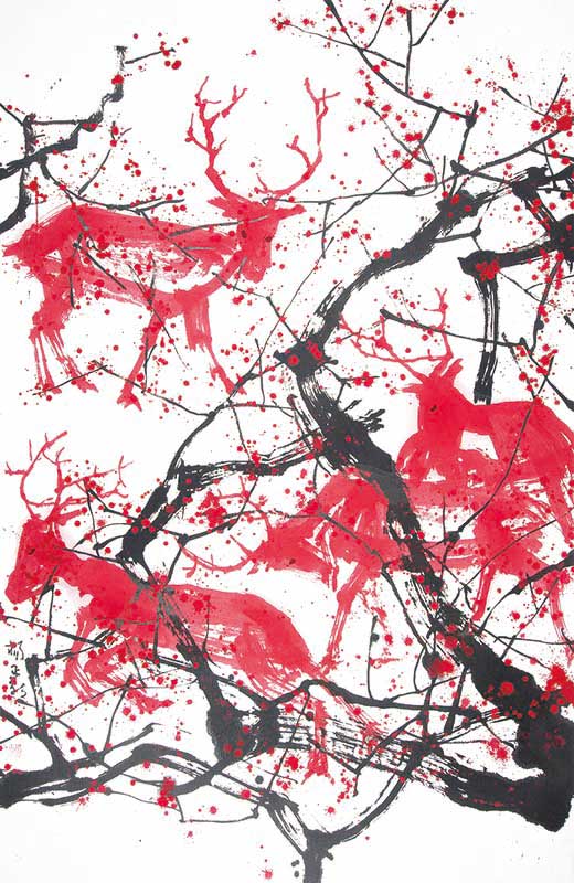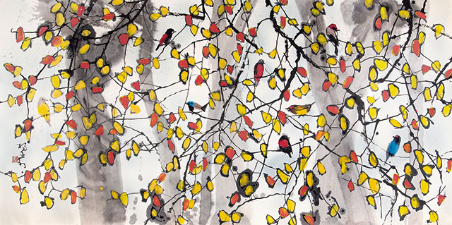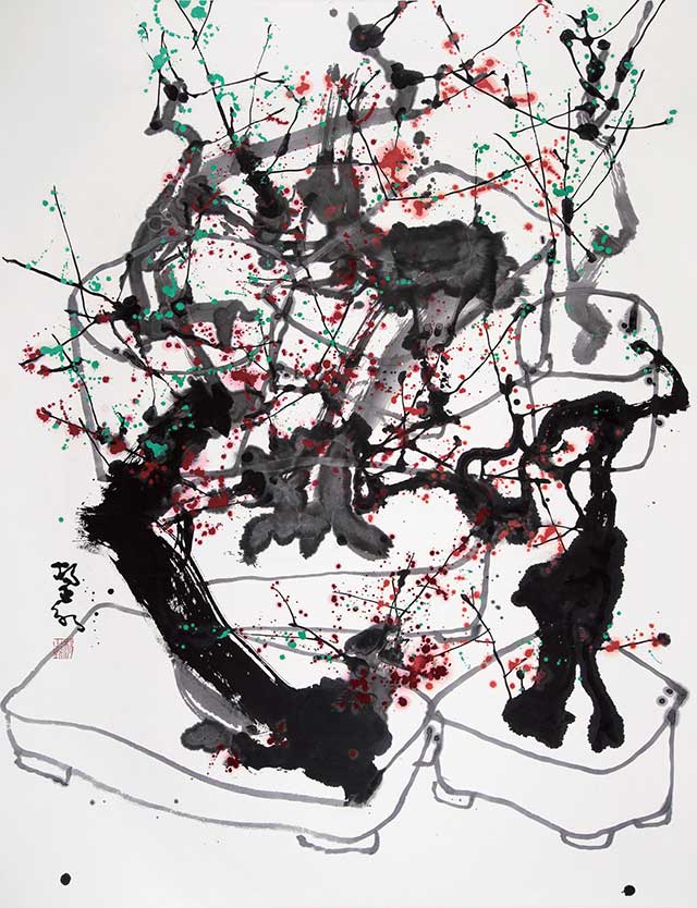 杨正新非常关注西方现代艺术中与中国绘画相通的地方,并且大胆将其引入到自己的画中,比如服从于线条意识的造型,书写型笔触的肌理痕迹,平涂式色彩的表现力以及不固定视点的构图方法等等,这些技法的引入使得他的国画具有了显而易见的现代性特征。而在进行这类实践的时候,杨正新依然是中学为体,西学为用,因为在他挥之不去的深层艺术观念里,牢牢扎根的依然是传统绘画的基本逻辑起点,也就是笔墨。