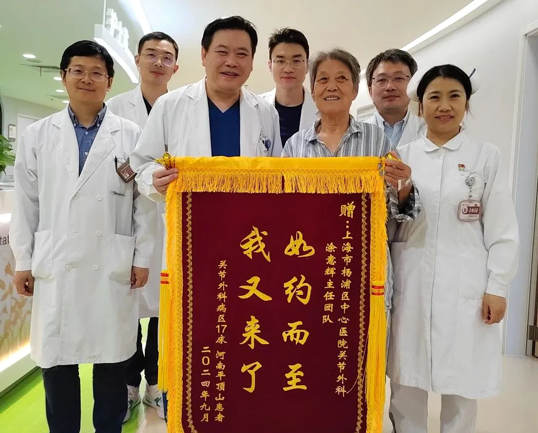 两年过后,他们带着准备好的这面“如约而至,我又来了”锦旗再次来到杨中心,涂意辉如约为其主刀,完成了“右膝关节单髁微创置换术”。手术时间仅用半小时,术后第一天葛奶奶就能下床行走。