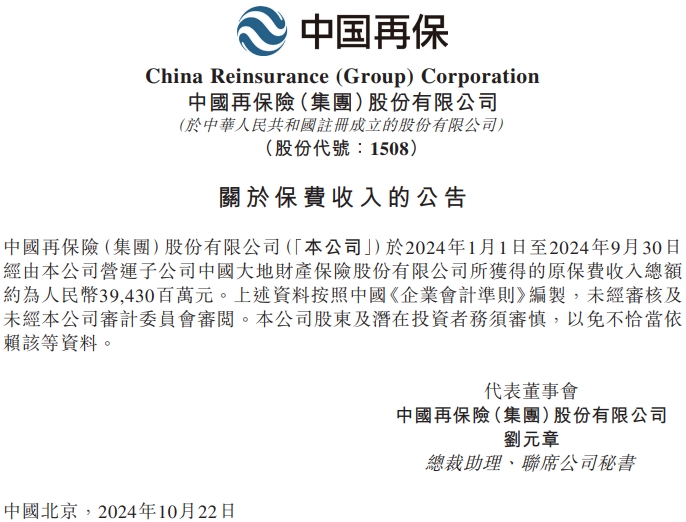 东方资讯消息,10月22日,中国再保险发布公告称,公司于2024年1月1日至2024年9月30日,经由公司营运子公司中国大地财产保险股份有限公司所获得的原保费收入总额约为人民币394.30亿元,较上年同期389.46亿元增长1.2%。