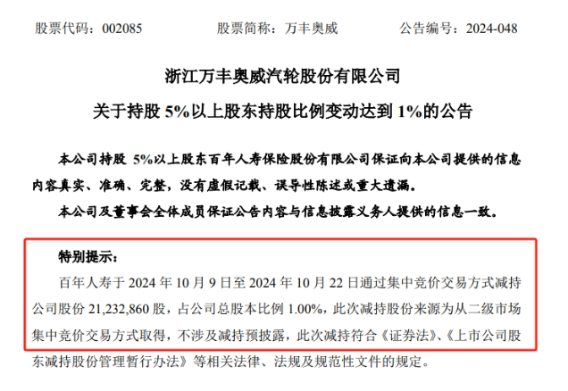 万丰奥威:百年人寿年内第四次减持 持股比降至5.87%
