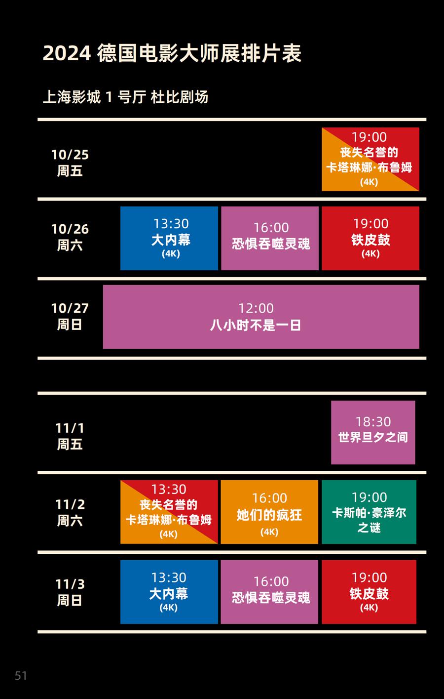 由上海市电影局指导、上海国际影视节中心特别策划的德国电影大师展将于10月25日在沪开幕。本次影展将放映沃尔克·施隆多夫、玛加蕾特·冯·特罗塔、赖纳·维尔纳·法斯宾德、弗里茨·朗、沃纳·赫尔佐格五位德国电影大师的八部影片,于10月25日、26日、27日和11月1日、2日、3日在上海影城SHO与观众见面。
