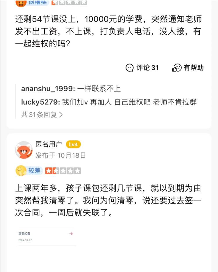 这位老师发布的信息称,他们今年10月中旬只收到了9月的部分工资,大家起初认为,可能只是工资晚发一点,仍坚持继续上课,直到10月21日,老师们收到总部无法运营的通知,才发现所有员工系统已被禁用。这位老师还提醒家长保存好合同等证据,维护自身权益。