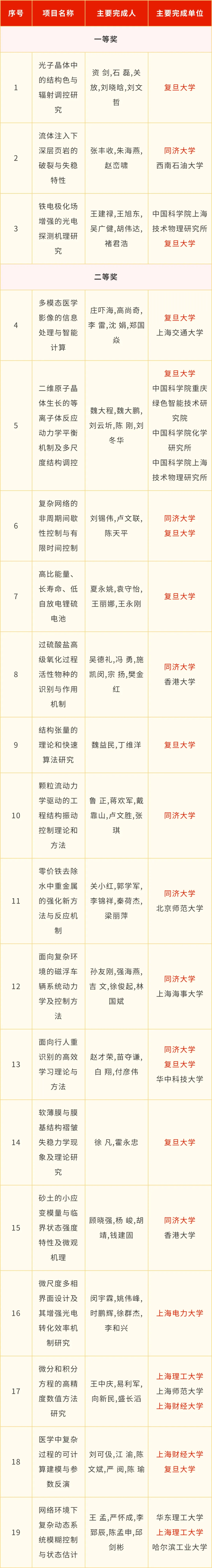 获得的第一完成人奖项有:青年科技杰出贡献奖2人(复旦大学修发贤、同济大学汤奇荣),自然科学奖17项(一等奖2项、二等奖15项),技术发明奖10项(一等奖6项、二等奖4项),科技进步奖28项(一等奖9项、二等奖19项),科学技术普及奖1项(二等奖1项)。