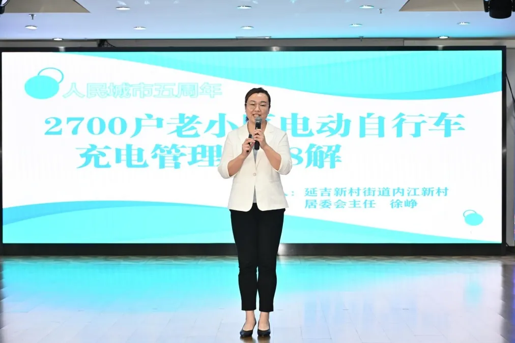“这次电动自行车管理的分享也是我们日常工作的缩影。我们是一个2700户的老小区,所以困难也非常的多。我觉得其中最关键的一点就是我们要用心用情站在居民的角度去思考问题,尽量的帮他们解决一些实际的困难。”延吉新村街道内江新村居委会主任徐峥在会上分享了主题为“4难8解”的演讲。