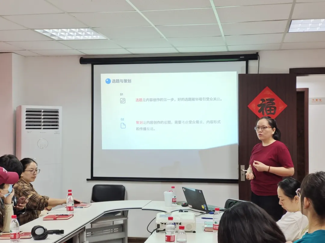 在培训会上,上海师范大学影视传媒学院的授课老师刘静,通过PPT形式详细讲解了自媒体的定义、分类以及内容创作技巧。她不仅让在座的学员了解了当前主流自媒体的基本概念和主流平台,还指导如何掌握自媒体的特点、受众需求和内容传播策略。