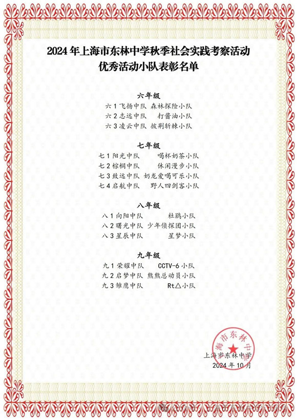 集体课程结束后,同学们开启了愉快的小队自由活动。大家都觅得一方惬意小天地,纷纷拿出各式各样的新鲜水果和美味零食,毫不吝啬地互相分享,空气中弥漫着幸福的味道。温和的秋阳透过公园内树木的层层枝丫,撒下斑驳的光影,一束束微光照射在那一位位青春少年的脸颊之上,展现着一种独属于秋季的生机与活力。以下是参与本次社会实践考察活动的"优秀活动小队":