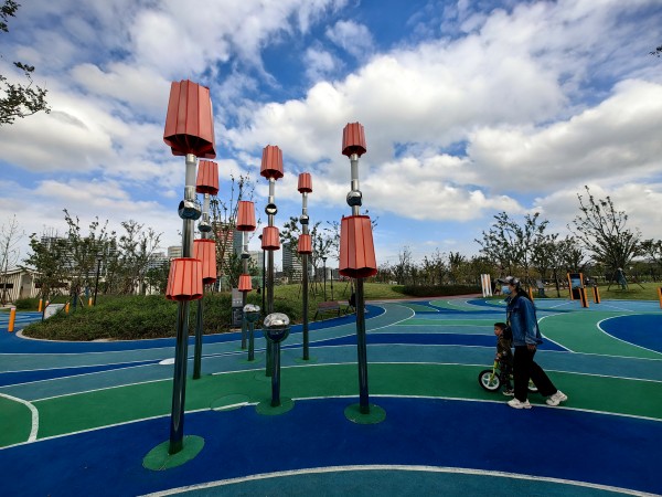 该园整体设计以罗店最具代表的“三湾九巷十八弄”水乡街市为灵感,在景观小品构筑物、节点铺装等细节上融入罗店花神、龙船、彩灯等文化元素,展现罗店地域人文特色。公园分为东、西两园,东园环湖设置千米主园路漫步道,步道穿过林波桥、青澜桥、风荷桥三座景观桥,串联赏樱林、阳光大草坪、绿影长廊、湖滨广场、游船码头、杉影林、风荷亭、真趣廊、智慧健身广场等多处功能场所及观赏景点。西园沿河两侧设置滨河步道,花溪桥居中跨河而立,沐香亭临水而设,成为公园的一道醉美靓丽风景。